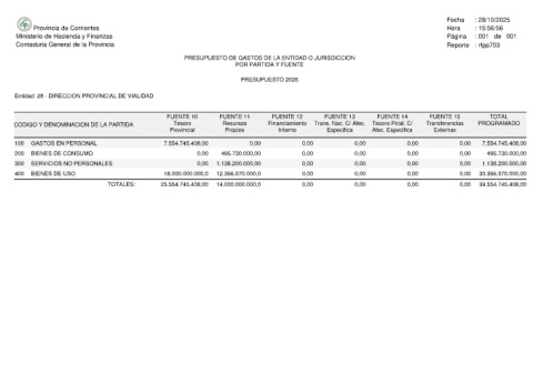 Provincia de Corrientes Ministerio de Hacienda y Finanzas Contaduria General de la Provincia Entidad: 28 - DIRECCION PROVINCIAL DE VIALIDAD CODIGO Y DENOMINACION DE LA PARTIDA GASTOS EN PERSONAL 100 BIENES DE CONSUMO 200 SERVICIOS NO PERSONALES 300 BIENES DE USO 400