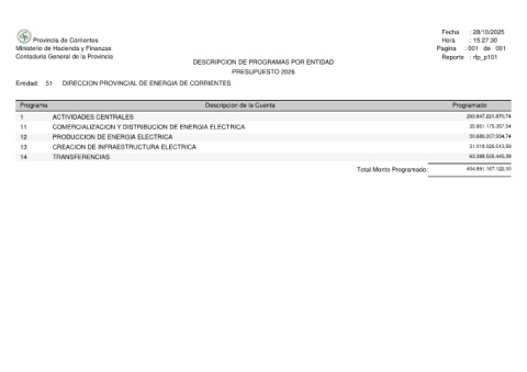 Provincia de Corrientes Ministerio de Hacienda y Finanzas Contaduria General de la Provincia DIRECCION PROVINCIAL DE ENERGIA DE CORRIENTES 51 Entidad: Programa ACTIVIDADES CENTRALES 1 COMERCIALIZACION Y DISTRIBUCION DE ENERGIA ELECTRICA 11 PRODUCCION DE ENERGIA ELECTRICA 12 CREACION DE INFRAESTRUCTURA ELECTRICA 13 TRANSFERENCIAS 14