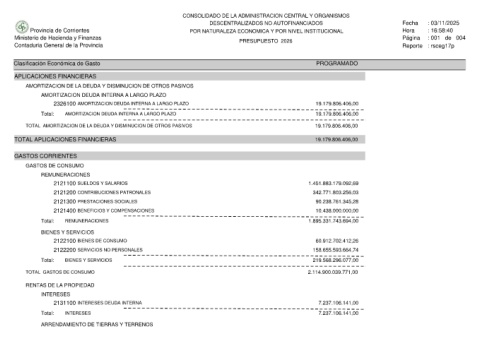 Provincia de Corrientes Ministerio de Hacienda y Finanzas Contaduria General de la Provincia Clasificación Económica de Gasto APLICACIONES FINANCIERAS AMORTIZACION DE LA DEUDA Y DISMINUCION DE OTROS PASIVOS AMORTIZACION DEUDA INTERNA A LARGO PLAZO AMORTIZACION DEUDA INTERNA A LARGO PLAZO 2326100 AMORTIZACION DEUDA INTERNA A LARGO PLAZO Total: TOTAL AMORTIZACION DE LA DEUDA Y DISMINUCION DE OTROS PASIVOS TOTAL APLICACIONES FINANCIERAS GASTOS CORRIENTES GA