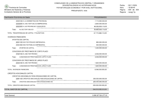 Provincia de Corrientes Ministerio de Hacienda y Finanzas Contaduria General de la Provincia Clasificación Económica de Gasto 2222100 2222200 2222300 AL SECTOR PUBLICO Total: TOTAL TRANSFERENCIAS DE CAPITAL Y FIGURATIVAS INVERSION FINANCIERA APORTES DE CAPITAL 2231100 2231200 Total: 2232100 Total: 2234100 Total: TOTAL INVERSION FINANCIERA CREDITOS ADICIONALES CAPITAL 2291100 Total: TOTAL CREDITOS ADICIONALES CAPITAL TOTAL GASTOS DE CAPITAL
