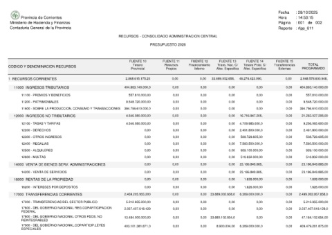 Provincia de Corrientes Ministerio de Hacienda y Finanzas Contaduria General de la Provincia CODIGO Y DENOMINACION RECURSOS 1 RECURSOS CORRIENTES 11000 INGRESOS TRIBUTARIOS 11100 - PREMIOS Y BENEFICIOS 11200 - PATRIMONIALES 11600 - SOBRE LA PRODUCCION, CONSUMO Y TRANSACCIONES 12000 INGRESOS NO TRIBUTARIOS 12100 - TASAS Y TARIFAS 12200 - DERECHOS 12300 - OTROS INGRESOS 12400 - REGALIAS 12500 - ALQUILERES 12600 - MULTAS 14000 VENTA DE BIENES SERV.