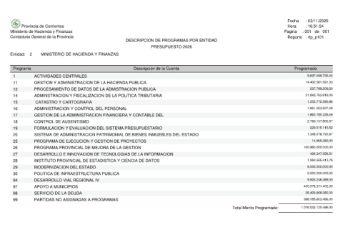 Provincia de Corrientes Ministerio de Hacienda y Finanzas Contaduria General de la Provincia MINISTERIO DE HACIENDA Y FINANZAS 2 Entidad: Programa ACTIVIDADES CENTRALES 1 GESTION Y ADMINISTRACION DE LA HACIENDA PUBLICA 11 PROCESAMIENTO DE DATOS DE LA ADMISTRACION PUBLICA 12 ADMINSTRACION Y FISCALIZACION DE LA POLITICA TRIBUTARIA 14 CATASTRO Y CARTOGRAFIA 15 ADMINISTRACION Y CONTROL DEL PERSONAL 16 GESTION DE LA ADMINISTRACION FINANCIERA Y CONTABL